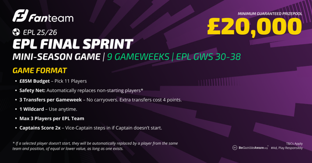 That is exactly the idea behind the Fanteam EPL Final Sprint, a mini-season fantasy contest covering the last nine Premier League Gameweeks (GW30–GW38) of the 2025/26 campaign. With a £20,000 minimum guaranteed prize pool, the Final Sprint effectively gives managers a brand-new season starting in Gameweek 30 on 14th March 2026. Even if your season-long fantasy teams have faded, this format offers a fresh opportunity to compete. FanTeam’s game is 18+ BeGambleAware T&Cs apply.